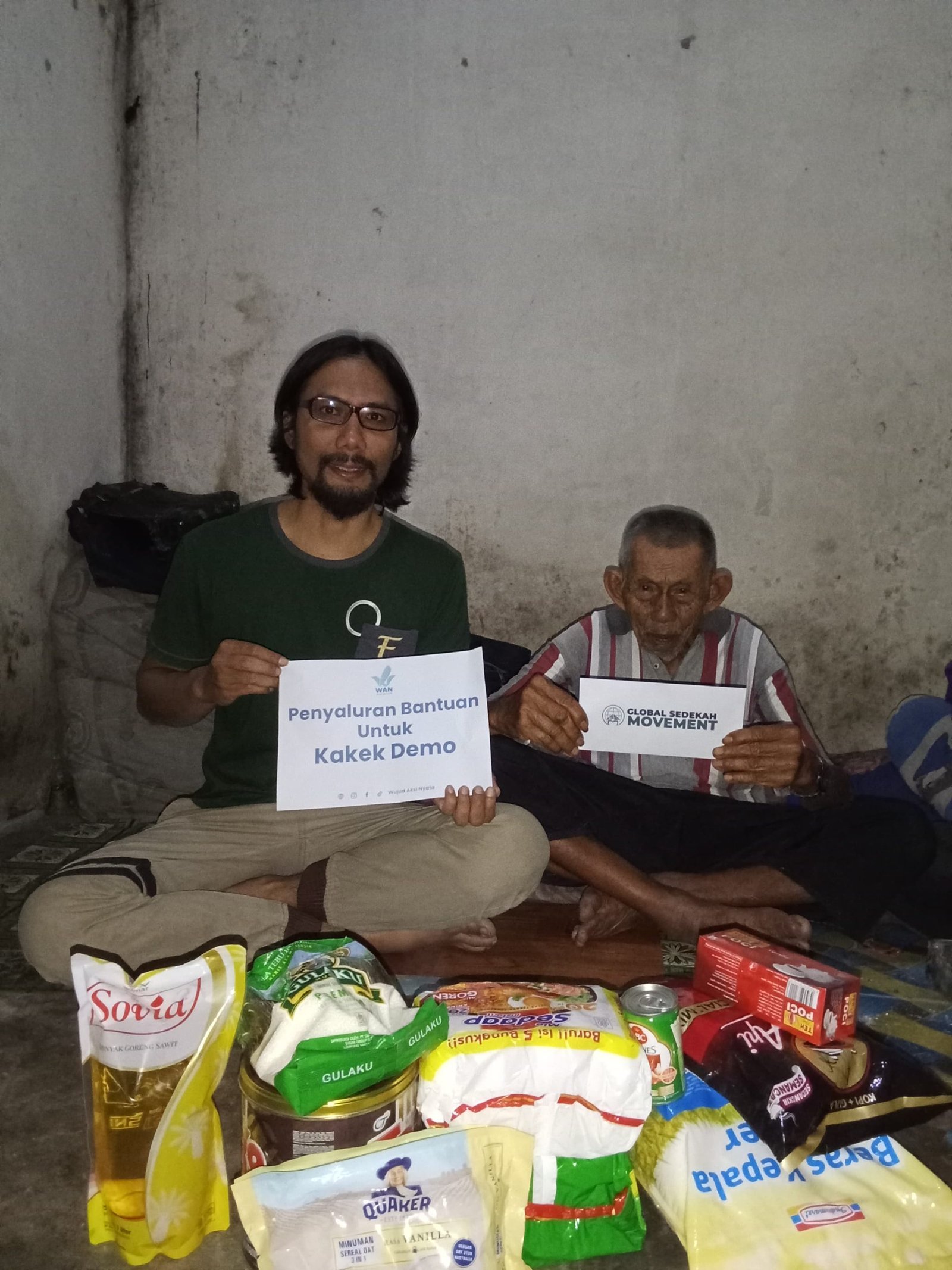 Bantuan yang kami berikan berupa sembako dan uang tunai untuk membantu memenuhi kebutuhan Kakek Demo.