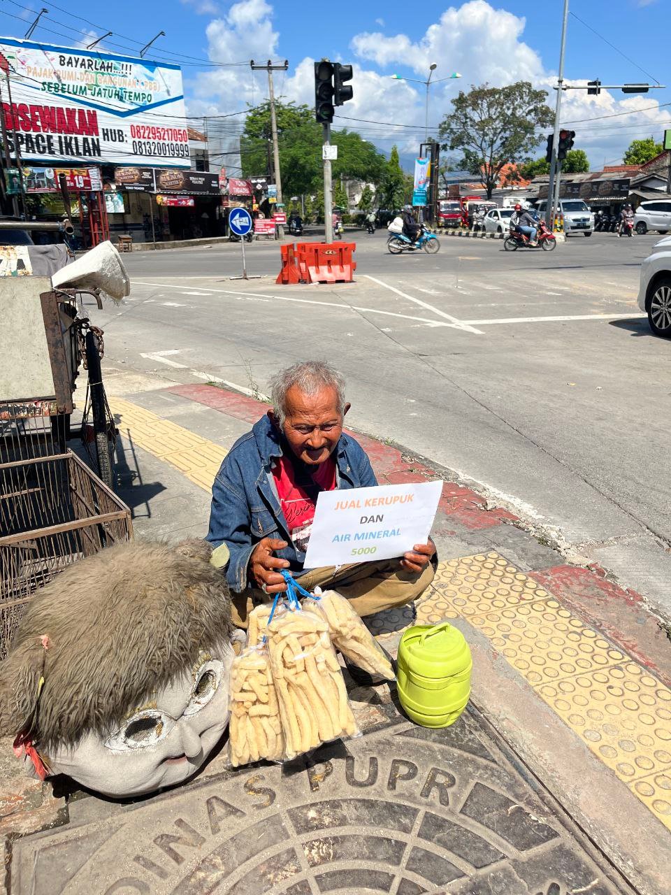 Setiap hari, Abah tertatih menuju perempatan untuk berjualan kerupuk. Dulu ia sanggup memikul air mineral, namun kini tenaganya tak lagi kuat. Dari setiap kerupuk yang laku, Abah hanya mendapat untung Rp1.000. Seringkali, kerupuknya hanya laku satu atau dua bungkus, bahkan tak laku sama sekali. Jika tak ada uang, Abah terpaksa tidak makan.