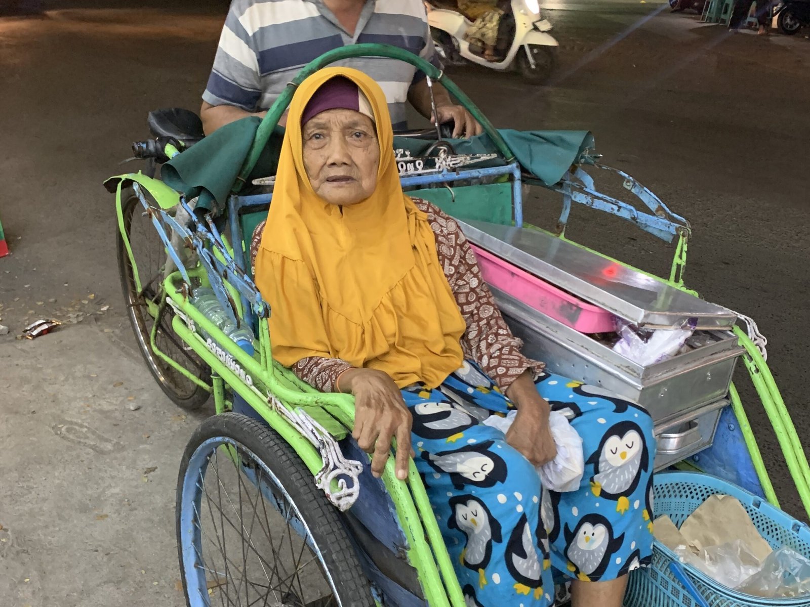 Mbah Urep (78 tahun), seharusnya menikmati masa tua dengan beristirahat. Namun demi membantu kebutuhan keluarga, beliau masih harus keluar rumah setiap malam. Usai maghrib, Mbah berjalan kaki cukup jauh untuk membantu anaknya berjualan sate usus, gorengan, dan donat kecil di pinggir jalan.