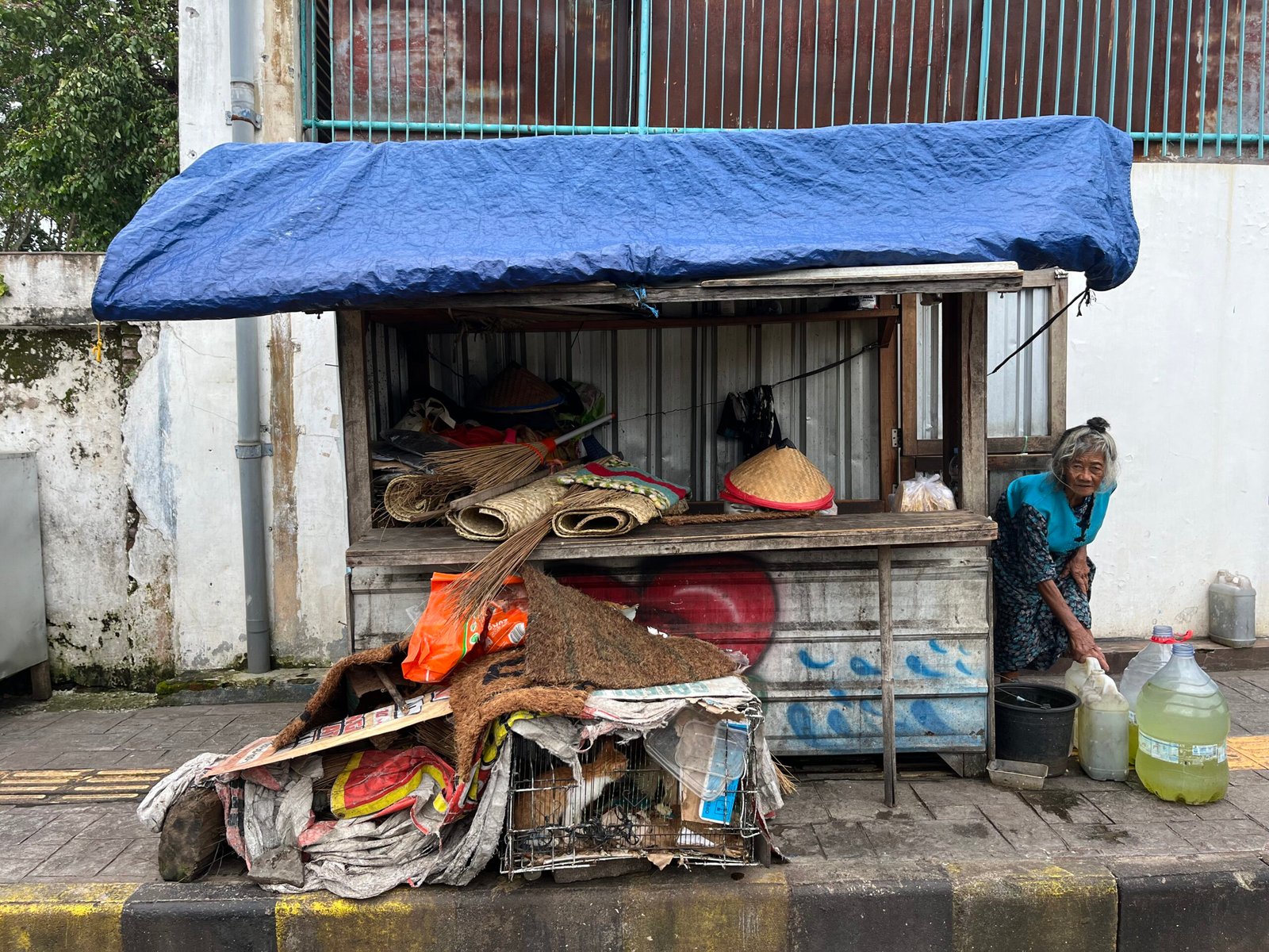 Di dalam kontainer tempat tinggalnya, tidak ada bantal ataupun selimut. Mbah hanya tidur di atas tikar sederhana, membuatnya sering kedinginan, terlebih saat hujan karena dinding kontainer sudah banyak berlubang. Bahkan, suatu malam kontainer tersebut pernah dibakar orang, namun beruntung Mbah segera terbangun dan berhasil memadamkan api.